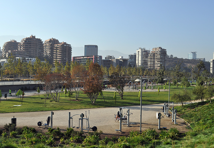 Además, una de las vistas más privilegiadas al área financiera de Santiago y sus nuevos rascacielos generan un entorno fantástico. En el área que ocupa el parque, que como otros espacios verdes capitalinos está en la rivera del río Mapocho, se encuentra el edificio consistorial de la Municipalidad de Vitacura y el reconocido restaurant El Mestizo, lo que permite acceder a servicios públicos, a los antes mencionados y al personal municipal de seguridad.